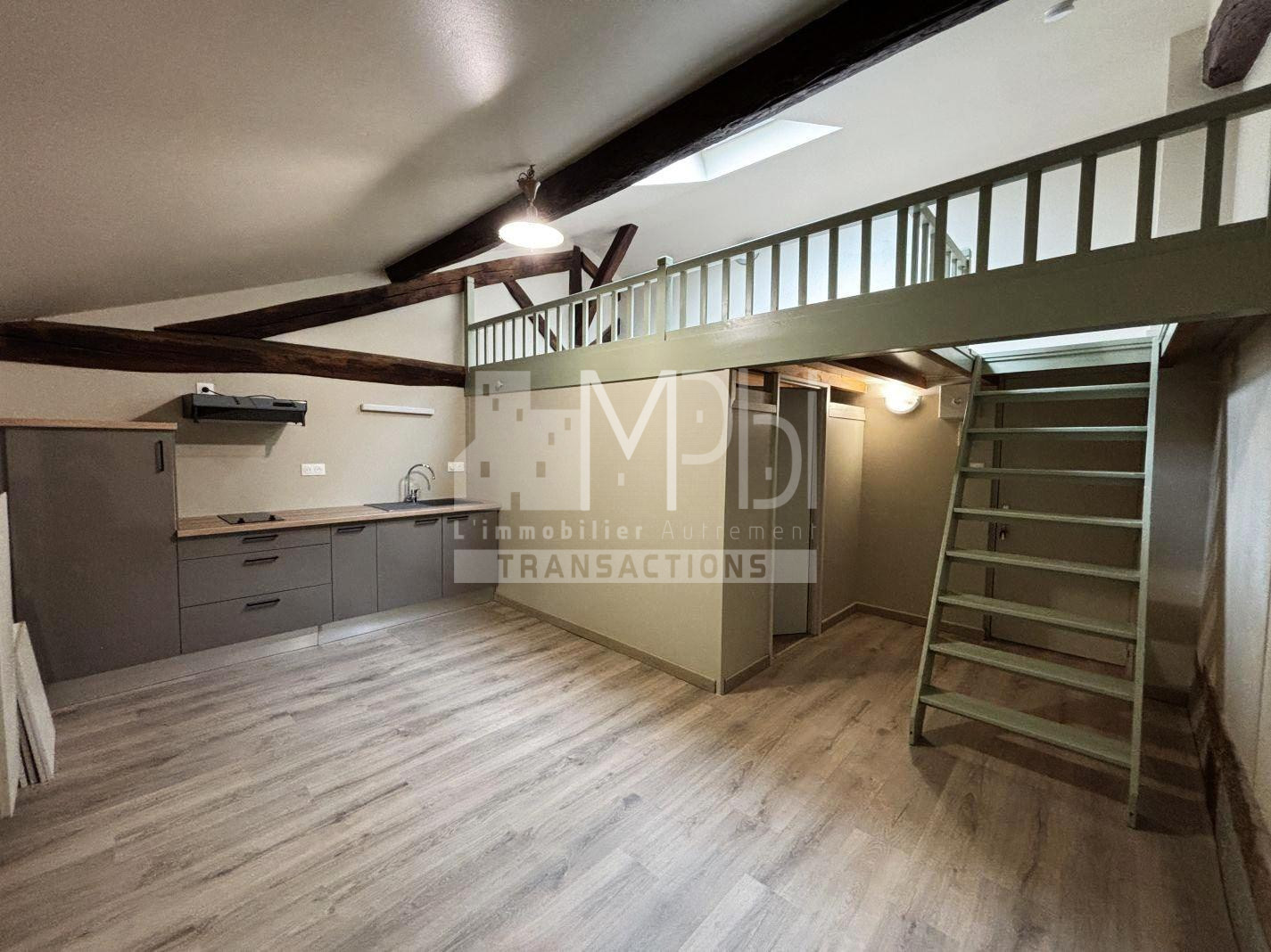 Studio – 2e étage (entièrement rénové) : cuisine équipée ouverte sur salon-séjour, mezzanine, salle de bains avec WC.