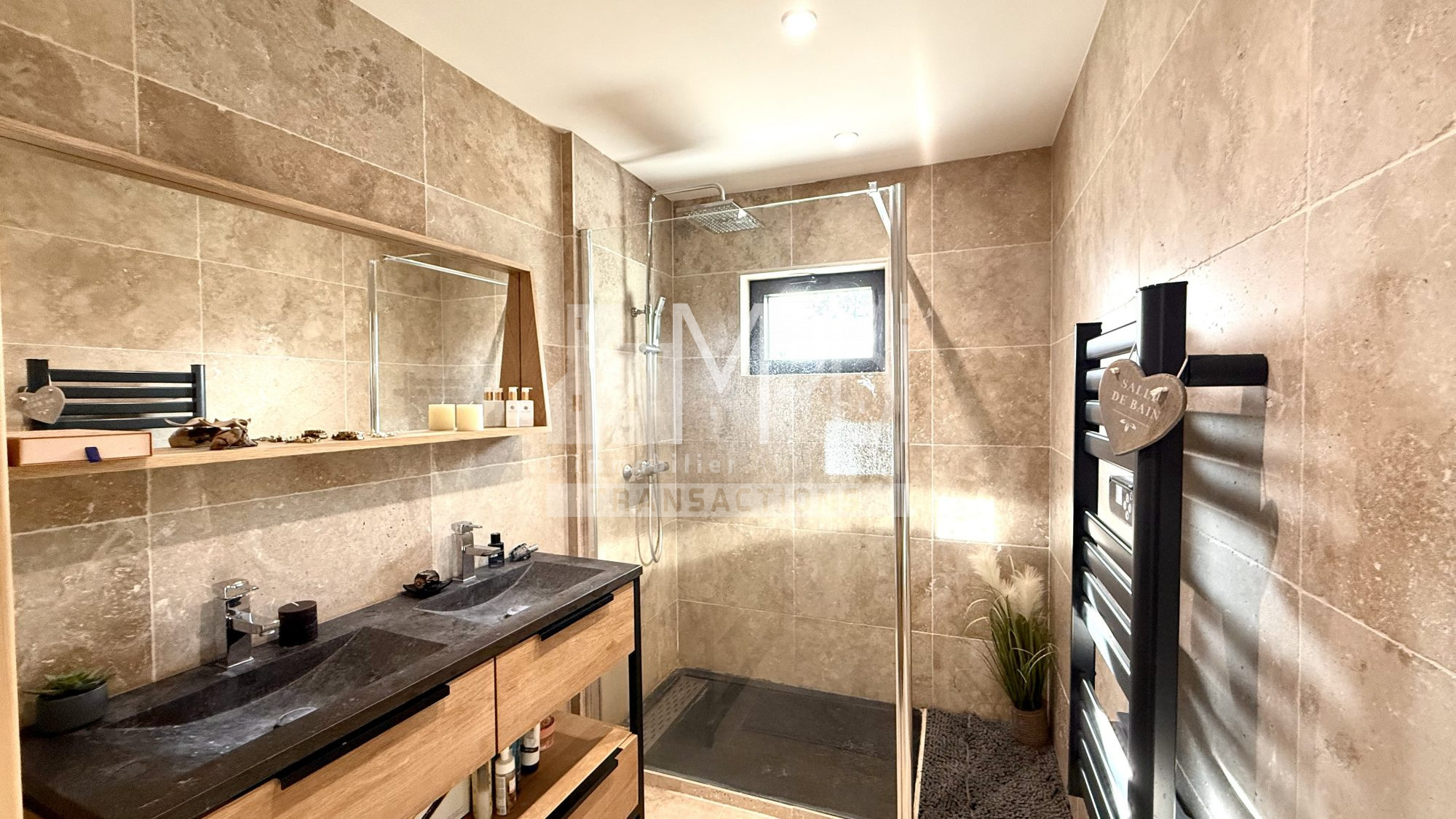 Une salle d’eau en travertin vient parfaire l’ensemble, équipée d’un meuble double vasque et d’une douche à l’italienne.